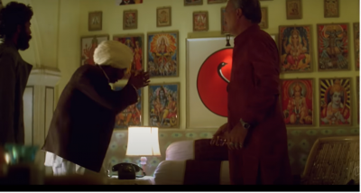 If one were to carefully analyze the movie, the observations would be distinctly different. Sarfarosh, for example, does not single out Muslims as the “bad guys”. In fact, some of the key conspirators, and arguably most of them, are shown as Hindus — devout Hindus! Take, for instance, the character of Rambandhu Gupta a.k.a Mirchi Seth, who is shown as the nodal agency to circulate the arms and other consignments procured from Pakistan into the interiors of India through an elaborately evolved network of individuals and organizations. Mirchi Seth is shown as having full knowledge of the Pakistani involvement in it through ghazal singer Gulfham Hassan, the main antagonist. Yet, he chooses to work with him. Throughout the movie, he is shown as a temple-going, devout Hindu engaged in a war against India. Every single frame of his character in the movie (see the image, for instance) reinforces his religious credentials as a Hindu. The same is the case with another character called Bala Thakur, who manages the supply of weapons to brigands like Veeran through Mirchi Seth. Thakur, a tilak sporting devout Hindu, who routinely takes astrological advice from Mirchi Seth, and his accomplice Shiva, are shown hand in glove with the proxy elements from across the border. The moviemakers go the extra mile to make sure that the religious affiliations of these bad guys are visible.